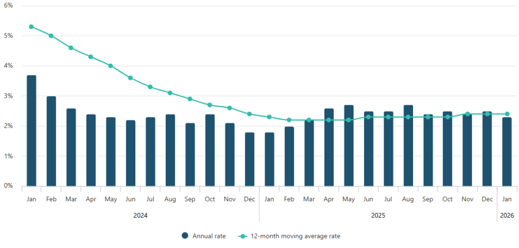 Inflation in Malta eased to 2.3 per cent in January 2026, down from 2.5 per cent in December 2025, as measured by the Harmonised Index of Consumer Prices (HICP).