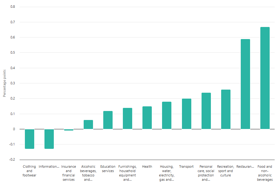 Restaurants and accommodation services registered the second-largest contribution, adding 0.59 percentage points, primarily reflecting rising prices for restaurant services. Recreation, sport and culture followed, contributing 0.26 percentage points due to higher recreational service costs.